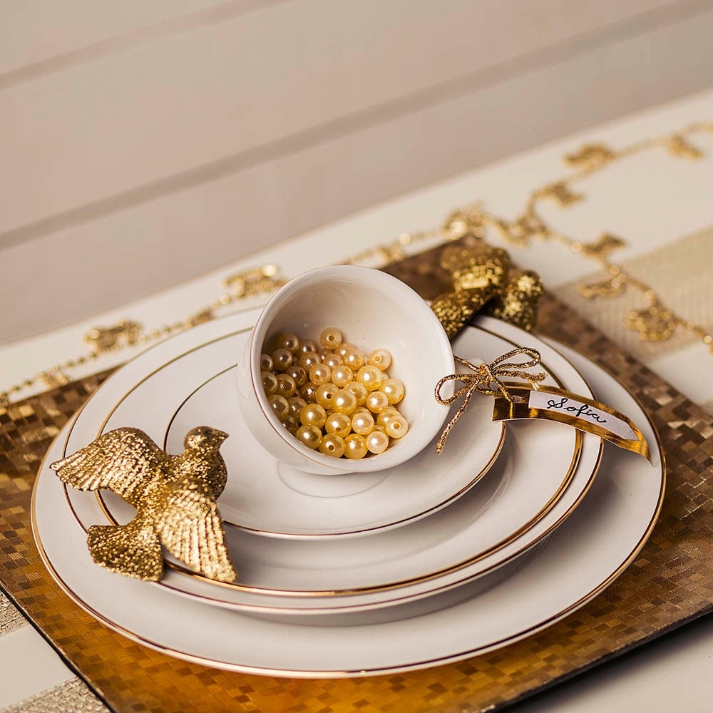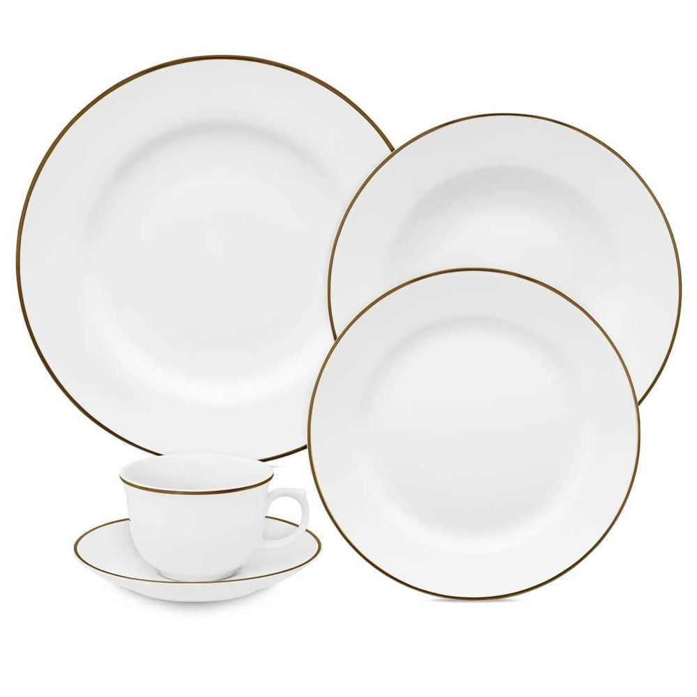 O aparelho de jantar acompanha: - 1 Conjunto com 6 Pratos Rasos - 1 Conjunto com 6 Pratos de Sobremesa - 1 Conjunto com 6 Pratos Fundos - 1 Conjunto com 6 Xícaras de Café e - 1 Conjunto 6 Pires |
