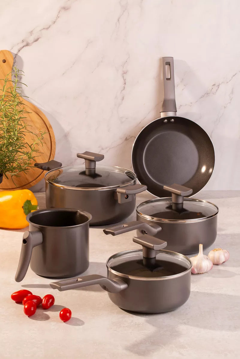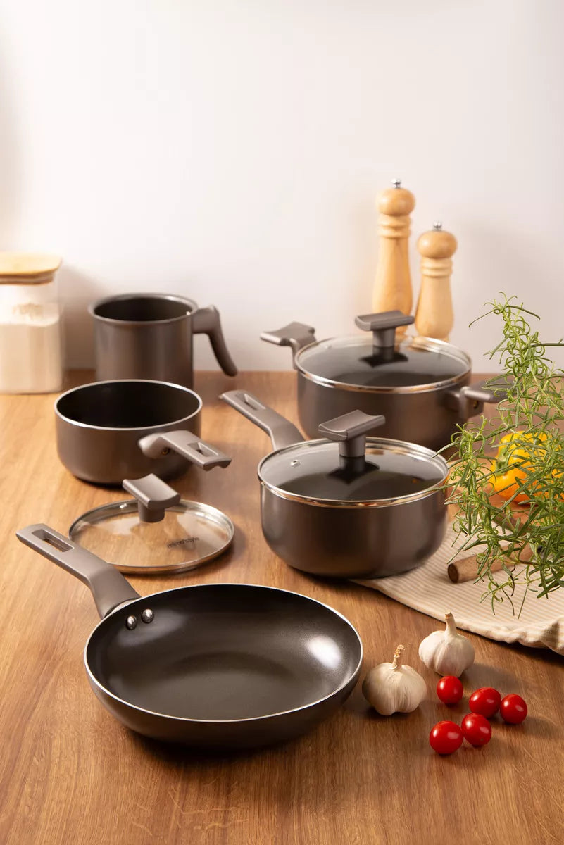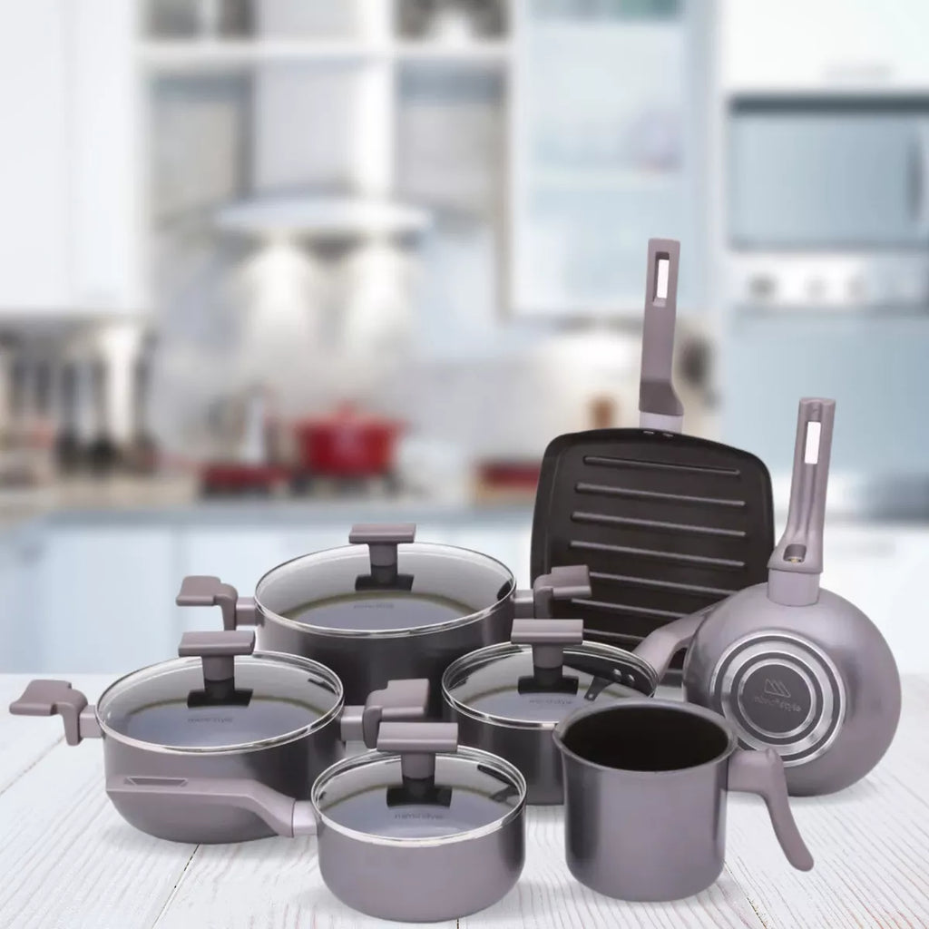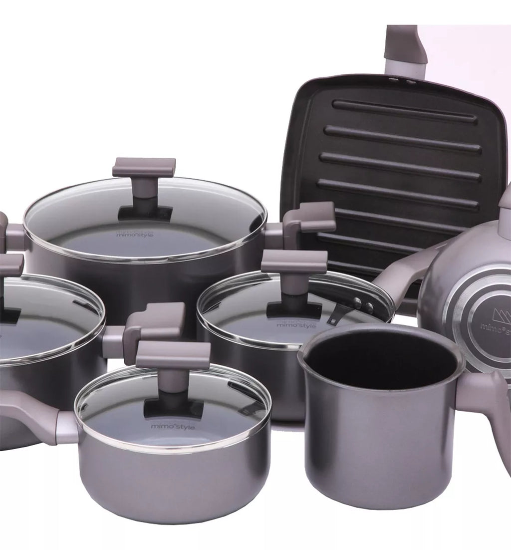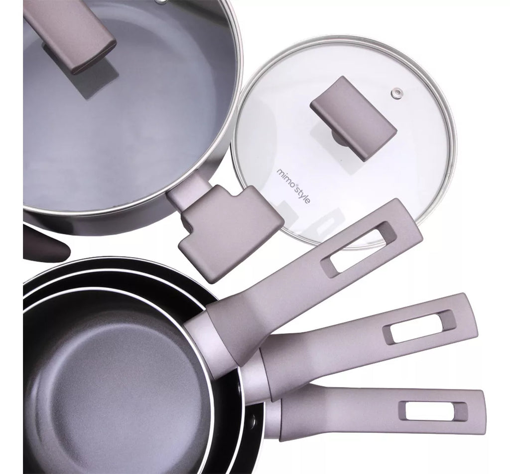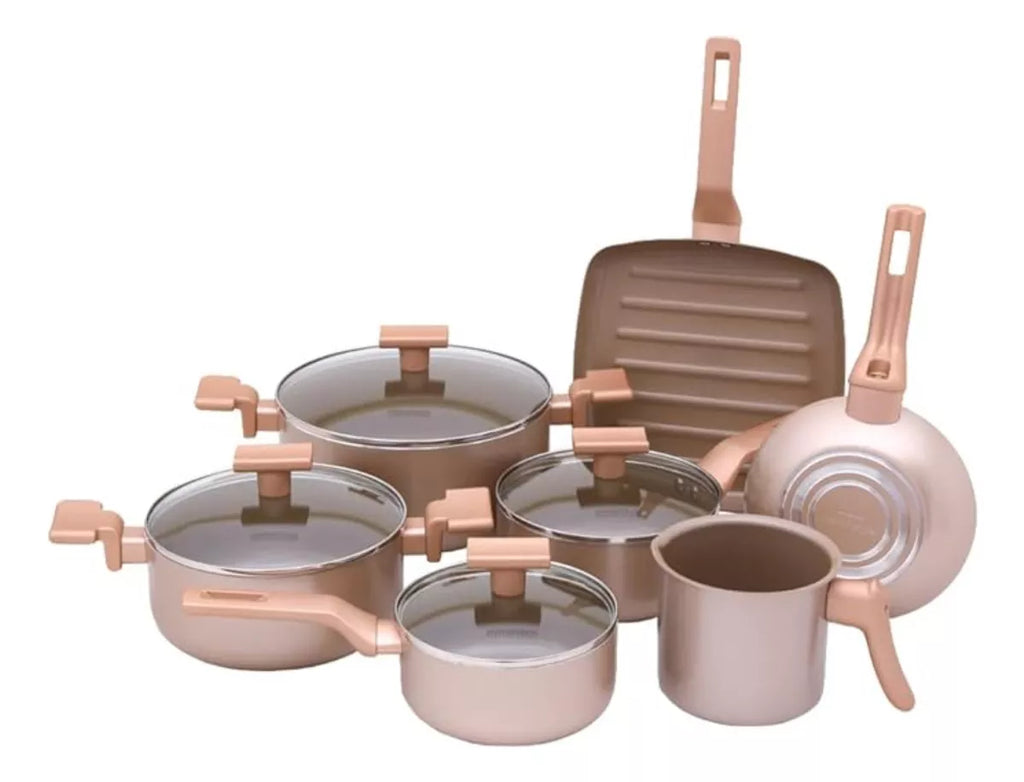 Conjunto de panelas com revestimento cerâmico antiaderente, adequado para uso em fogões elétricos, vitrocerâmico e a gás. A base em alto relevo revestida em cerâmica previne marcas em fogões tipo vitrocerâmico. O material proporciona condução uniforme do calor, permitindo cozinhar em fogo baixo ou médio. Superfície lisa que facilita a limpeza e o manuseio. Não libera substâncias tóxicas nos alimentos.